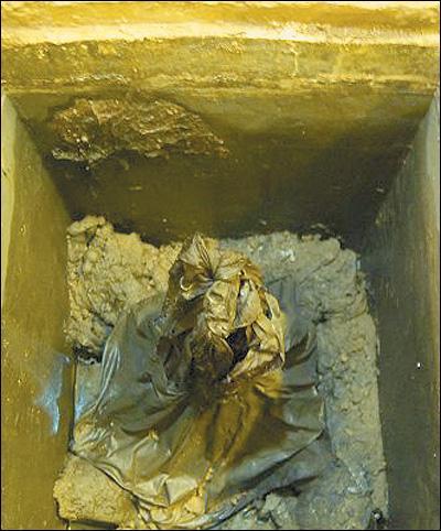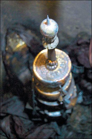 出土时被丝织物包裹、金色泛着蓝色幽光的塔身。