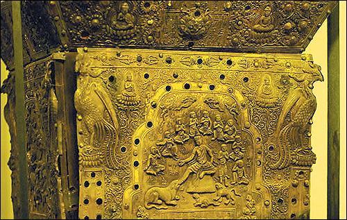 记者了解到,塔王被请出后的第一件事就是“擦澡”,专家用蒸馏水、棉花在塔王的表面一点点地擦洗,如今,凡是见过它的专家都会惊艳,去除蒙尘的塔王散发出金色的光泽,表面布满了大大小小的雕刻图案,如果加上20多幅故事图画上的人物,阿育王塔佛像人物像共超过了100个,举世罕见。其中,佛祖释迦牟尼生平故事以连环画的形式雕刻在8片山花蕉叶上,每片上有2-3个故事,共约20幅图案分别描述了六牙白象入梦、佛祖诞生、菩提树下证道、佛祖涅槃等20个故事。