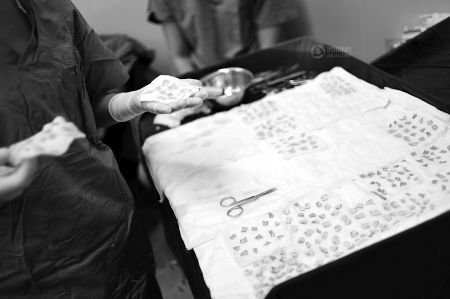 医生将皮剪成指甲盖大小,间隔着植在迎春身上。
