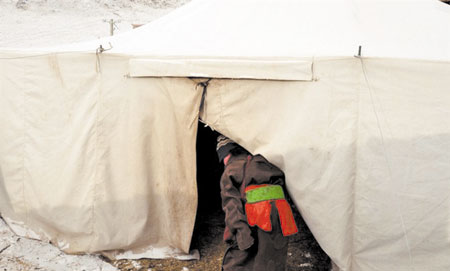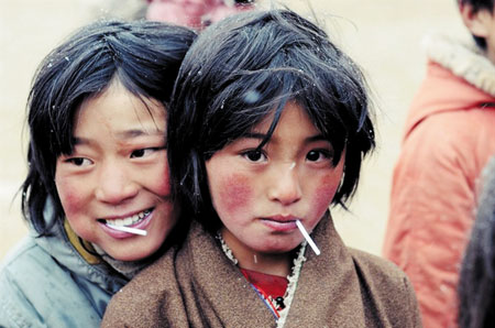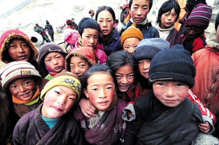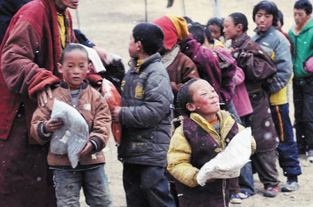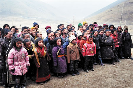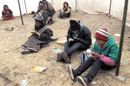 在全年下雪的石渠县,孩子们就这样天天坐在地上念书