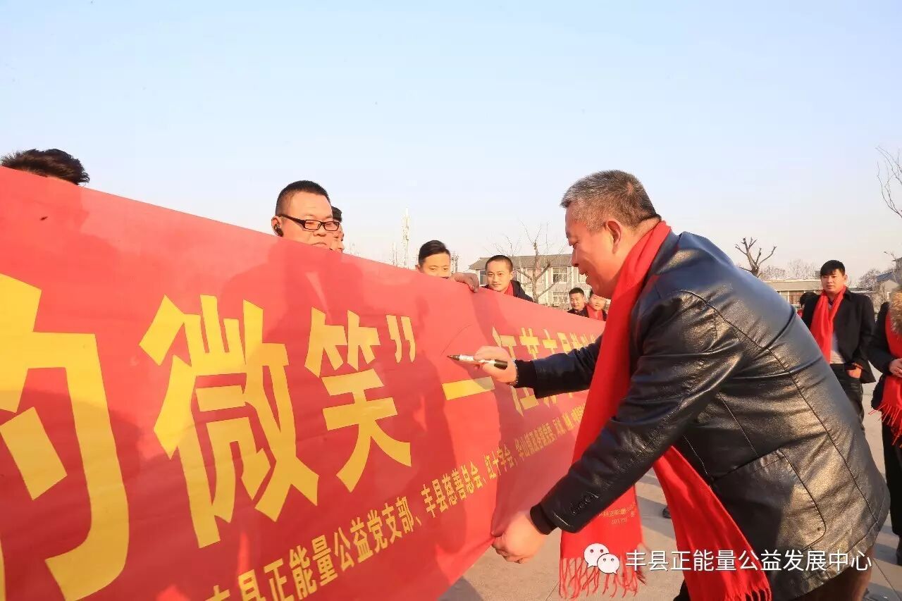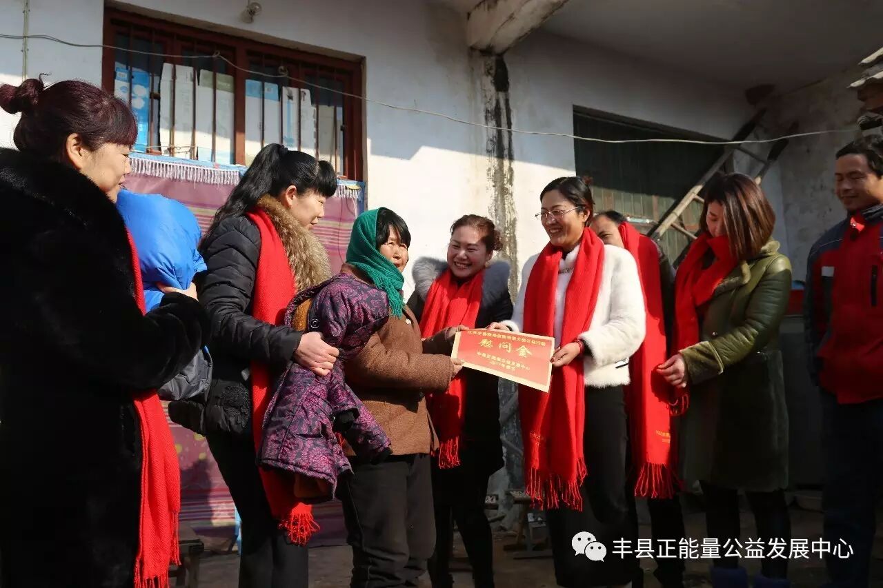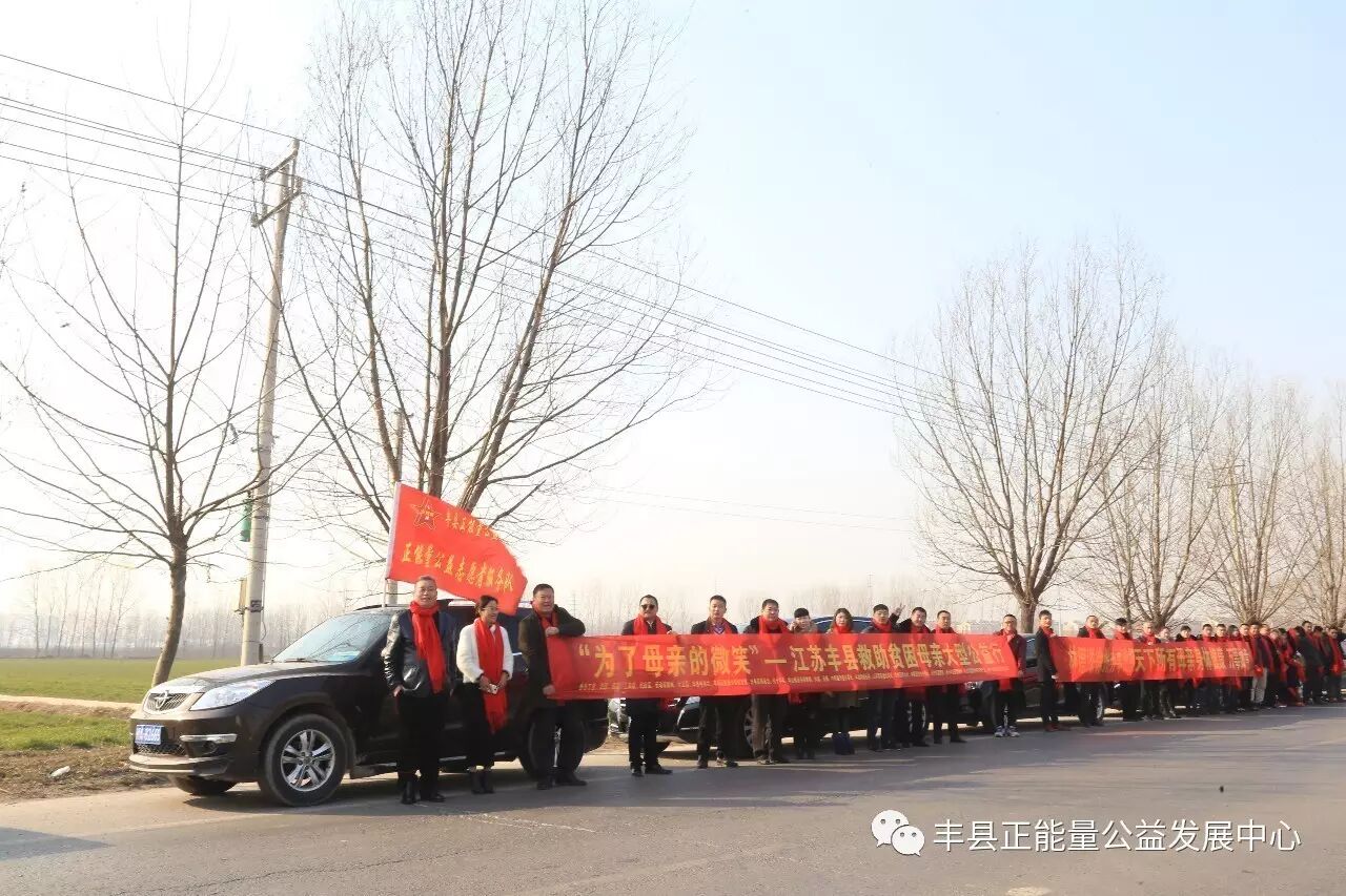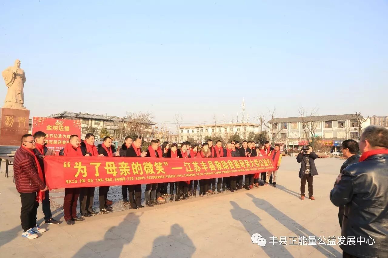 为了母亲的微笑,为了祖国的未来和民族的兴旺,为了让更多的贫困母亲走出贫困,走向富裕,走向文明。丰县正能量公益发展中心党支部联合县总工会、县工商联、妇联、团委、丰县电视台、劳动保障局、民政局、计卫局、华山镇党委、梁寨镇党委、师寨镇党委、中阳里街道办事处、孙楼街道办事处、范楼镇党委、欢口镇党委、常店镇党委、首羡镇党委、王沟镇党委、宋楼镇党委、大沙河镇党委、丰县慈善总会以及爱心企业江苏路泰建设集团有限公司、徐州嘉利木业有限公司、徐州旺达食品有限公司、徐州凤凰湖休闲养老产业有限责任公司、徐州大汉雄风旅游文化有限公司、林德漆徐州办事处、徐州鸿益新型墙材有限公司、丰县博爱医院、徐州锦茗商贸有限公司、徐州旺达食品有限公司、金辉影视制作中心等发起“为了母亲的微笑—救助贫困母亲”大型公益捐助活动。不少企业在发展同时,不忘社会责任,积极投身家乡公益慈善事业,更多爱心人士和企业一道释放正能量,为全丰县贫困母亲的幸福贡献出力量。