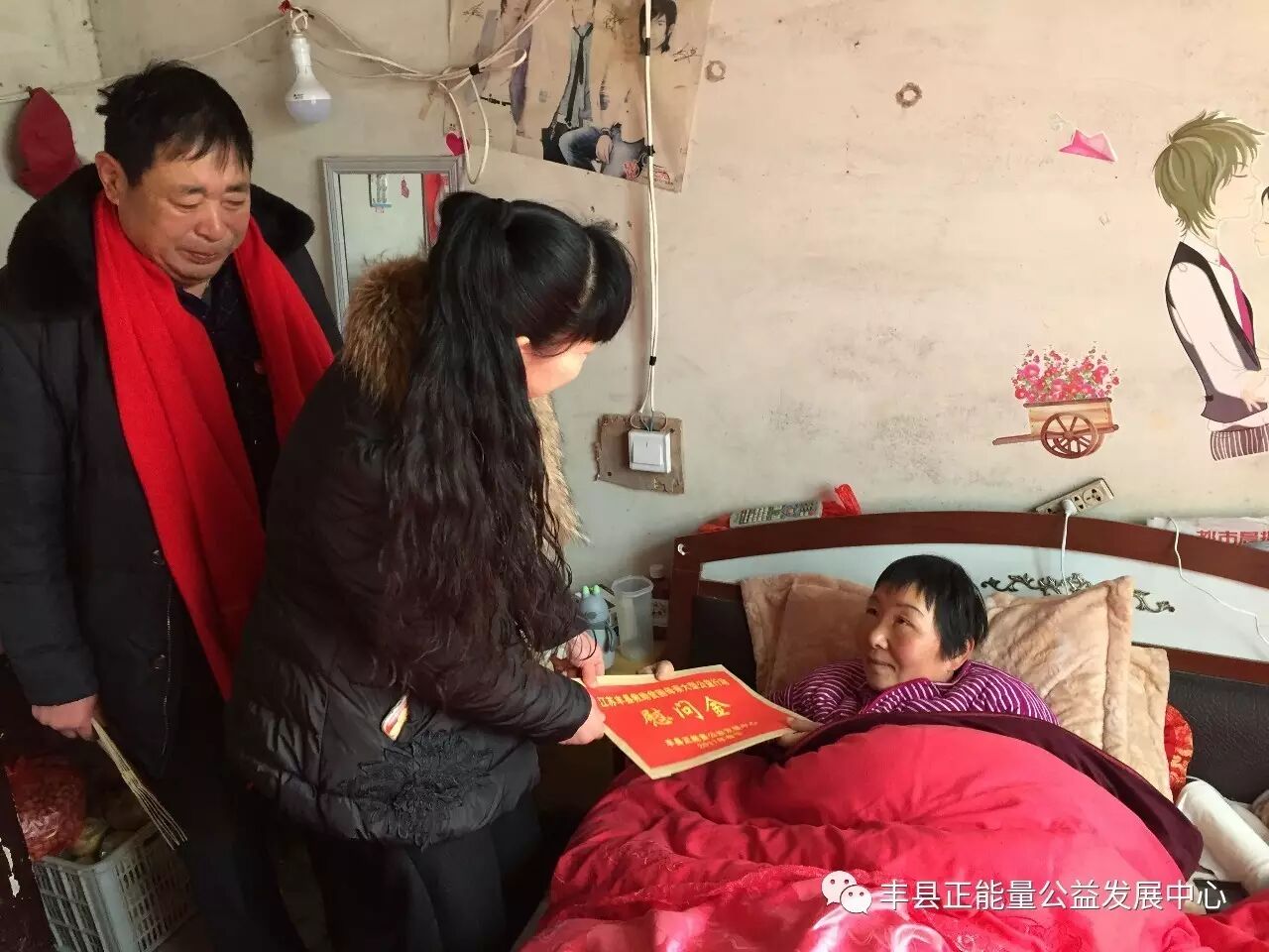 上午9点半,华山镇党委副书记高源、宣委方三发等工作人员早早的在华山镇芦楼村口等着,一起去看望今年40多岁的李秀侠。十多年前她患上乳腺癌,手术切除一边乳房,两年后复发又切除另一边乳房。从此厄运就没有离开这个家庭,就在她刚患病时,其丈夫崔井权也患上乙肝,经过半年治疗基本康复,然而一年后因为车祸导致腰部严重受伤,再也不能从事重体力劳动。这还不算,李秀侠身上的癌细胞不断转移,反复手术治疗,后来又切除了子宫。去年6月份不小心摔倒,大腿股骨头断裂一直无法复原,原来是癌细胞已经转移至骨头,从此卧床不起,由于无钱继续治疗,在徐州住院几个月后只能在家。芦楼村在华山镇是比较富裕的村庄,大部分村民早几年都已经搬进干净漂亮的新农村,李秀侠家因为看病早已家徒四壁,还住在低矮破旧的80年代建的房子里。元旦前,万理事长带领党员干部就来到她家进行走访和慰问,并把她列为“精准扶贫”对象。