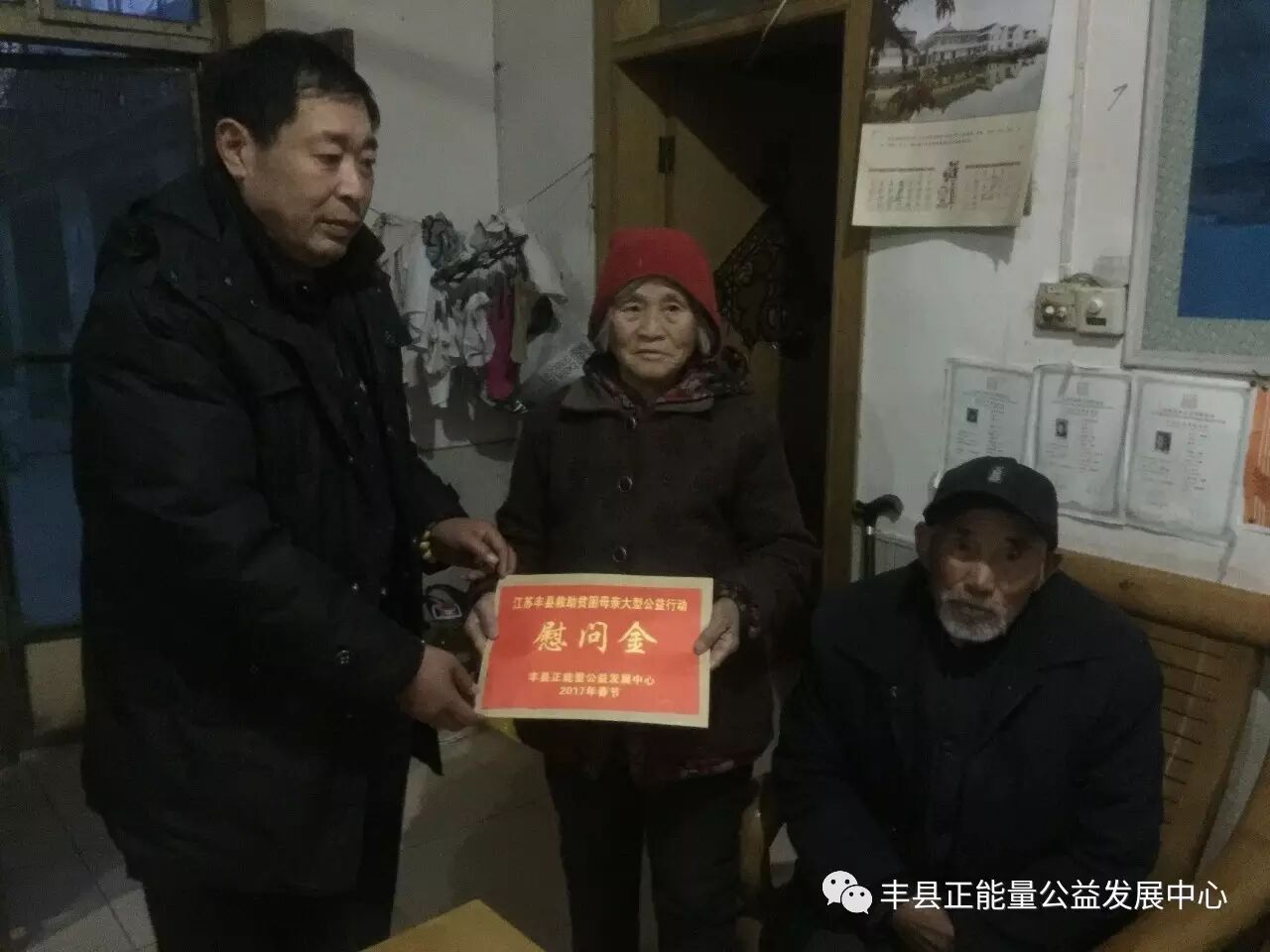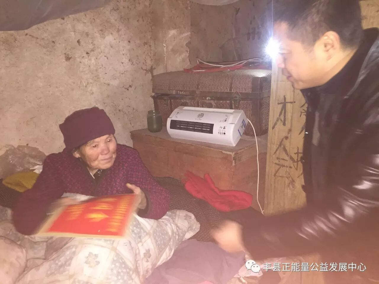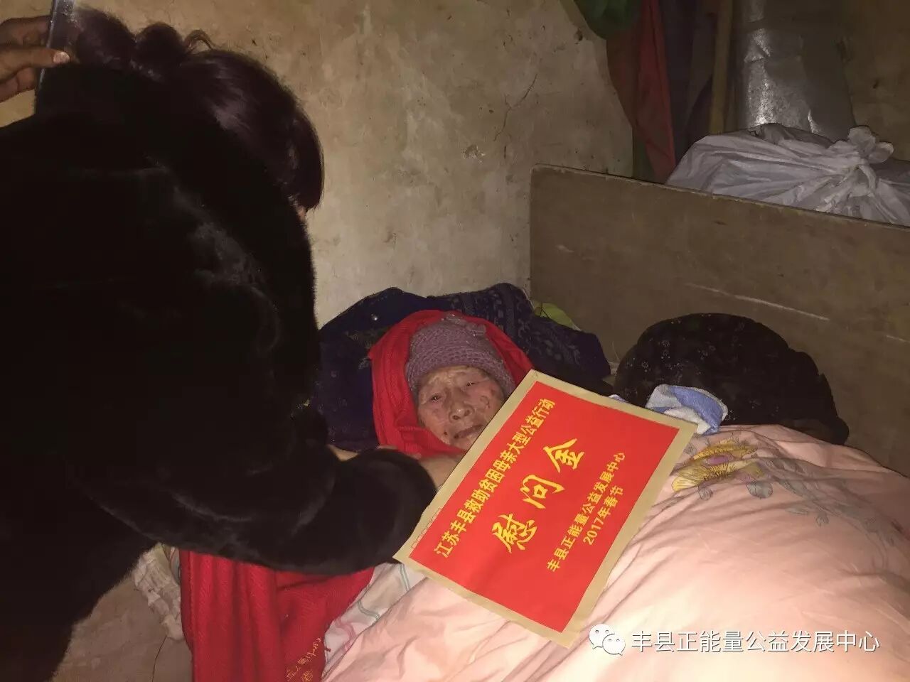 由于春节临近,很多人及车辆返乡导致到处堵车,仅在王沟街上来回堵车就多达2个小时,理事长万利忠下车疏导近1个小时才得以通行。来到大沙河镇黑楼一组405号岳赵氏家时,天已经黑了。镇里的宣委王大伟等早已在此等候。今年已经93岁的岳老妈妈,丈夫去世20多年,大儿子自幼痴呆,今年72岁,不但毫无劳动能力,还需要照顾。二儿子2010患老血栓现已瘫痪,也全靠岳妈妈照料,家庭无经济来源,生活相当艰苦。今年又因在照料大儿子把胯骨跌断,无钱医治一直卧病在床,痴呆儿子的生活无人照料。还好镇村两级组织没有忘记她们,给予很大的帮助,志愿者团体也经常过来看望。由于天完全黑了,屋里灯光又黑暗,大家打开手机灯光照明,但还是不能为卧床的老人家拍好一张相片。在破败的院子里万利忠理事长感谢镇村对老人的帮助,并告诉他们继续照顾好这一家,如果需要资金会继续提供支持。