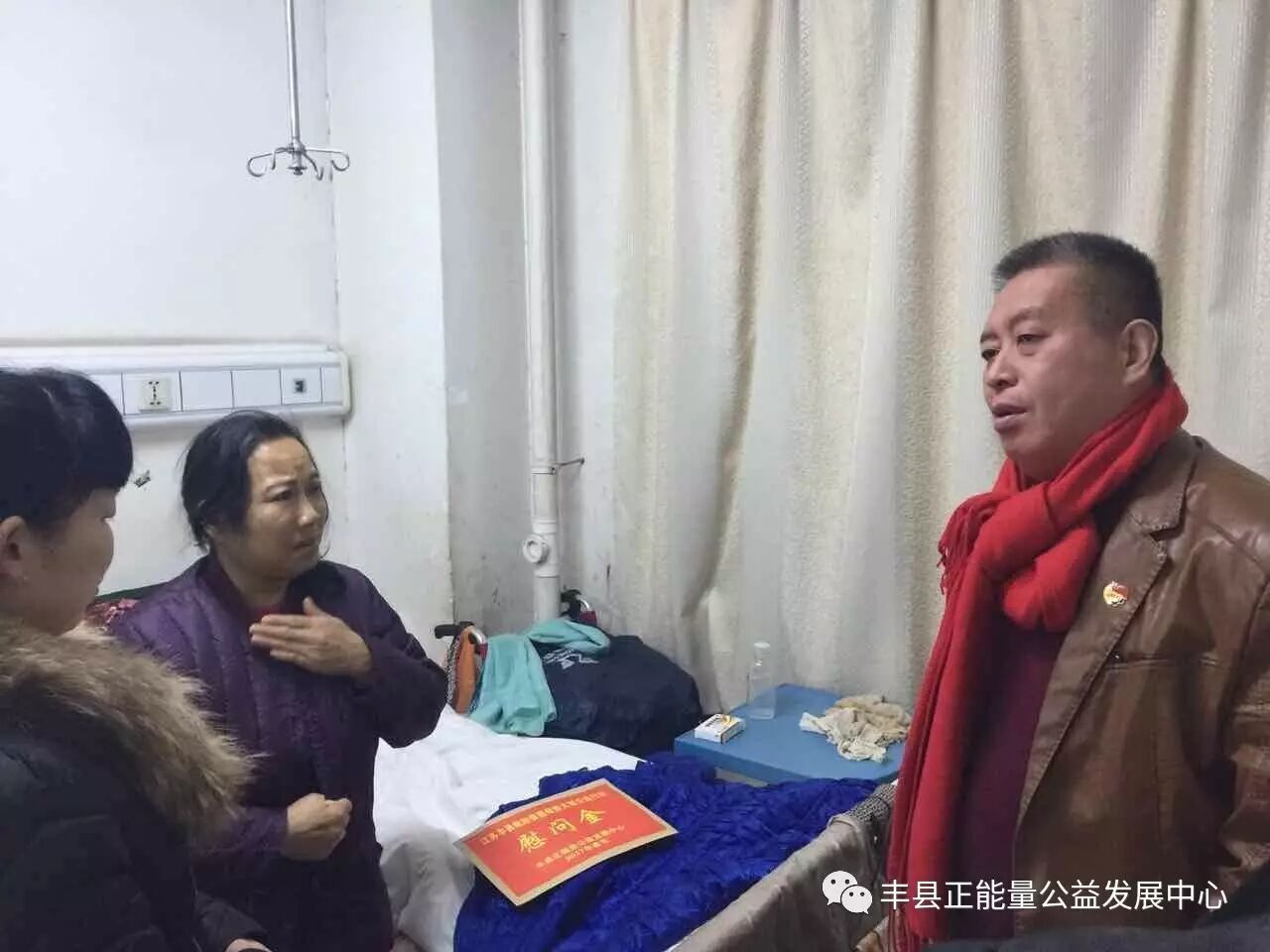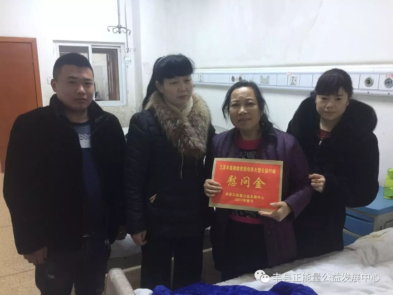 大家返回城里时已经7点多,此时华灯初上,流光溢彩,街道上都是匆忙的行人和车辆。最后一位需要看望的人是丰县正能量公益的老熟人,她虽是孙楼街道仇庄人,但她早已无家可归了。祝素英今年才55岁,年纪不大却命运多舛。严格的讲她还不是一位母亲,因为她没有生育,艰难的命运也是由此开始的,但作为一名妇女她拥有和其他母亲一样的被救助权利,所以我们破例把她列为救助对象。她的第一次婚姻由于丈夫出轨,加上没有生养孩子而离异,再嫁后由于父亲患病花掉很多医疗费,原本并不富裕还有两个孩子的第二任丈夫也和她离婚了。自此她一人外出打工,回来家乡就暂时居住在弟弟家。去年3月,只身在天津打工的祝素英在天津血液病研究所查出急性白血病,便回到家乡寻求治疗。然而祸不单行,其二弟弟这时也患了股骨头坏死,三弟媳妇得了甲状腺癌,皆因无钱治疗,她被赶出弟弟家。无计可施的祝素英在人民医院急诊大厅里住了下来,后来院长丁时义得知情况后为她在急诊安排了临时床位,并多次为其减免透析费用。县民政局得知后,也为其快速办理了大病临时救助及低保。丰县正能量公益已经多次对其进行救助。问到祝素英在哪里过年,她哭着回答在医院,万理事长当即安排妇联主席王秀丽、副主席韩保莲在春节期间帮助她安排饮食及生活用品。