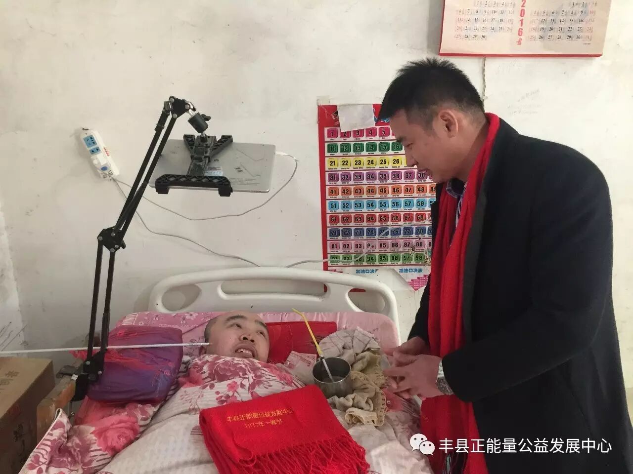 欢口镇菜园83号王云平年纪不大,却遭受的磨难太多,原因都是因为她的儿子李祥宁,今年32岁的李祥宁在2006年由于工作中意外导致高位截瘫,脖子以下失去知觉,四肢无法活动,生活从此不能自理。当时虽获得20万的赔偿,但两次看病就花光了,在之后的四处求医中花光所有积蓄还欠下大笔的借贷,祥宇多次要轻生,王云平拼死挽救儿子的生命。就这样当时才41岁的王云平的一切就交给了儿子,这十年她给予儿子无数次重生的力量,她是一位伟大的母亲,我们向这位母亲致敬。由于志愿者的帮助祥宁学会了使用平板电脑,他用牙齿咬着输写棒一个字一个字的点,他开始在网上写文章、还卖东西,看到这种情形一同走访的丰县正能量公益理事长单位、林德漆徐州办事处的总经理王站立又单独的把几百元钱塞到祥宁的枕头下面。