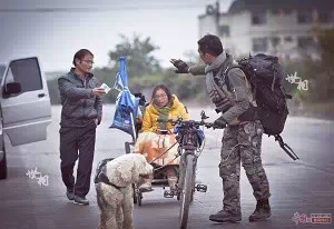 排头是一只叫“阿宝”的犬,小伙丁一舟骑着单车在中间,“阿宝”和单车上都拴着一根绳子,拉着走在最后的一辆轮椅,患有“企鹅病”的赖敏就坐在这个轮椅上面。