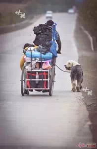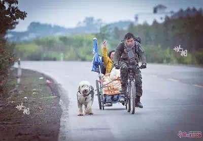 丁一舟骑单车拉着后面轮椅上的赖敏,缓缓地行走在路上,阿宝走在右前方,身上系着一条绳子拉着单车,碰到上坡时,一舟就会下车,推车前行。阿宝像个懂事的孩子一样,低着头,伸着脖子,蹬着腿,卖力地使着劲,拴在身上的绳子绷得紧紧的。