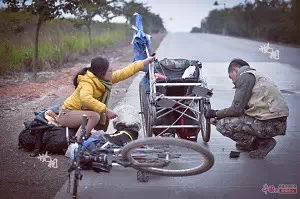 旅行中,不仅天气变化无常,轮椅时常也会出现故障。前左侧的小轮已经破裂,每次抛锚,丁一舟就拿出钳子和铁丝,蹲下来像维修工一样,仔细固定后再绕上几圈铁丝。小轮看上去已面目全非,右侧的大轮也明显向外晃。“每次遇到困难,老公都会及时解决,我很佩服他。”赖敏说。