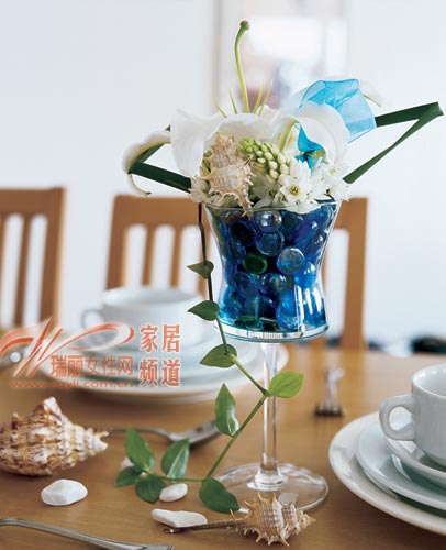 高脚杯,不仅可以用来盛放美酒,还能作为别致的花器使用。餐桌上的高脚杯旁铺满水蓝色的透明花石,冰凉的石子让人联想到透着凉意的海水。在高脚杯的杯口处,随意放置一些花材:百合一枝独秀,素雅的野花点点散落,长茎的绿藤由上而下搭配出错落有致的效果。再将三两个贝壳点缀桌上,让进餐过程变得轻松、凉爽。
