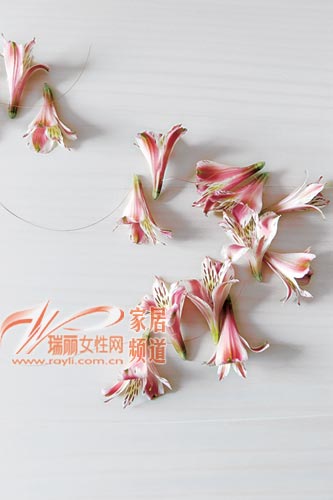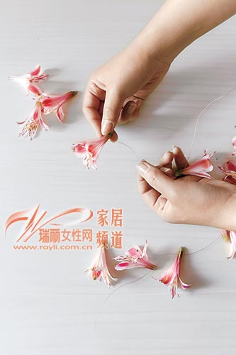用细线穿起花朵选用一根较长的透明细线将花朵按顺序穿起来。要根据灯罩表面的褶皱个数来确定花朵的大致数量,以褶皱数量的一半为宜。